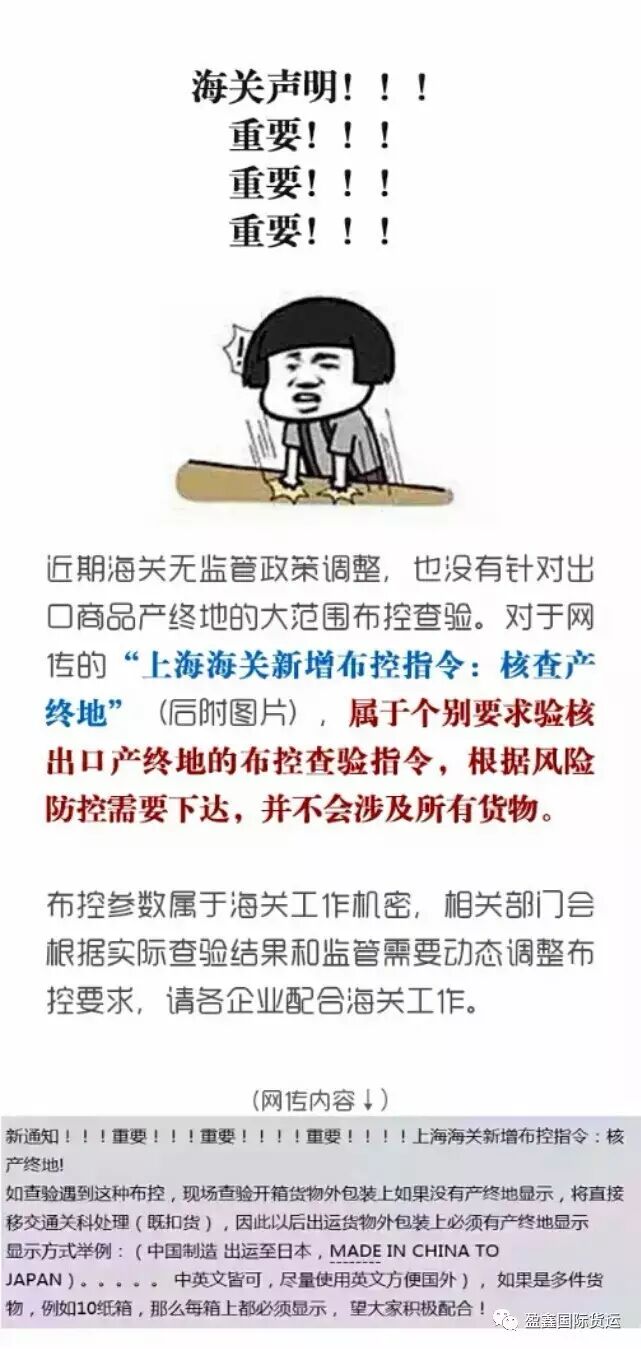 8月23日,上海海关12306服务热线发布消息声明:针对上海海关新增布控指令,属个别要求核验出口产终地的布控查验指令,根据风险防控需要下达,并不会涉及所有货物。